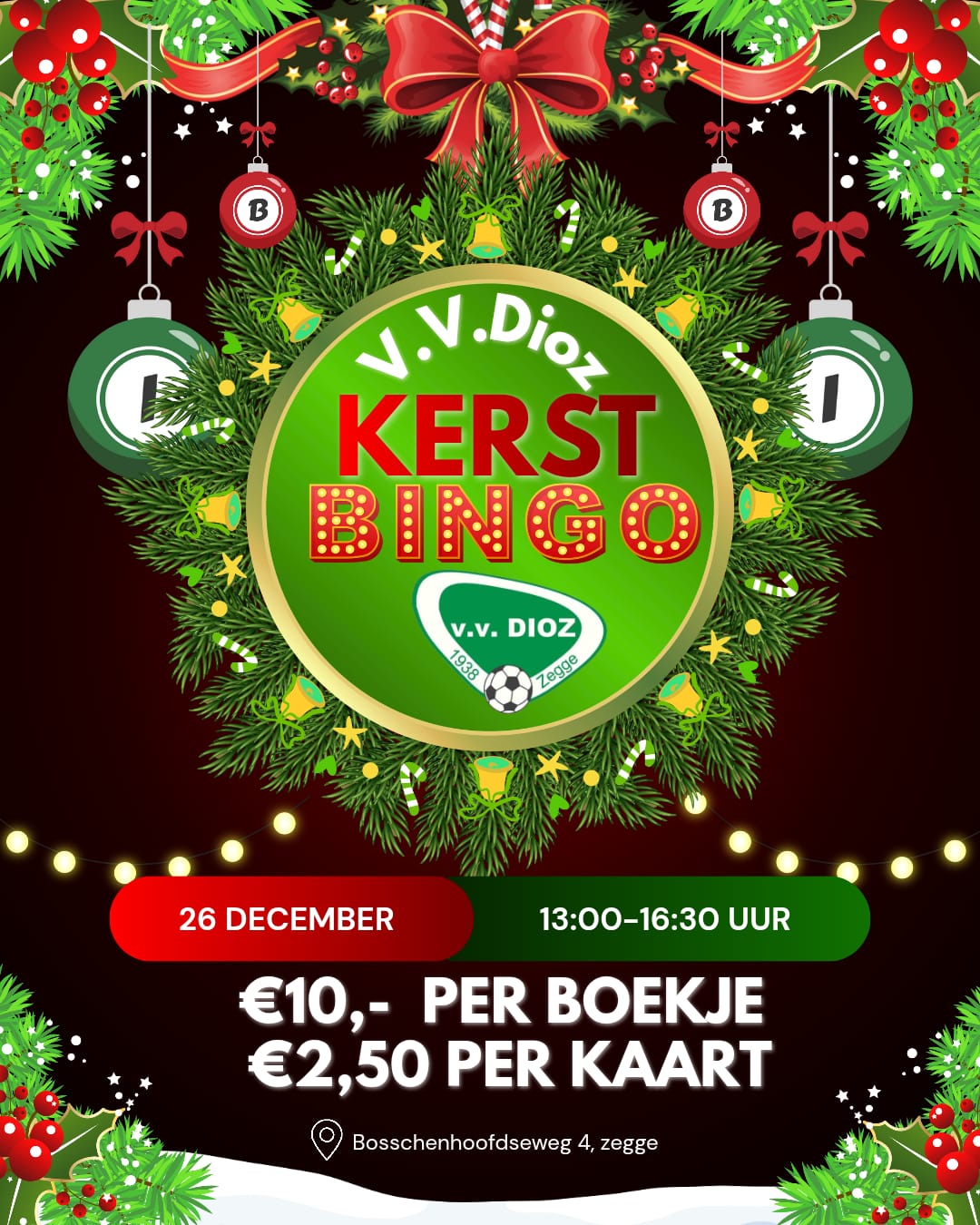 Sportpark 'de Linden' (v.v. DIOZ) Bosschenhoofdseweg 4, Zegge🎄 Kerstbingo bij V.V. DIOZ! 🎄 Ook dit jaar staat er tijdens de feestdagen weer iets gezelligs op de planning bij onze club! Op tweede kerstdag organiseren we een sfeervolle kerstbingo bij V.V. DIOZ. Een middag vol spanning, gezelligheid en natuurlijk leuke prijzen! De bingo vindt plaats in de middag en is geschikt voor jong...