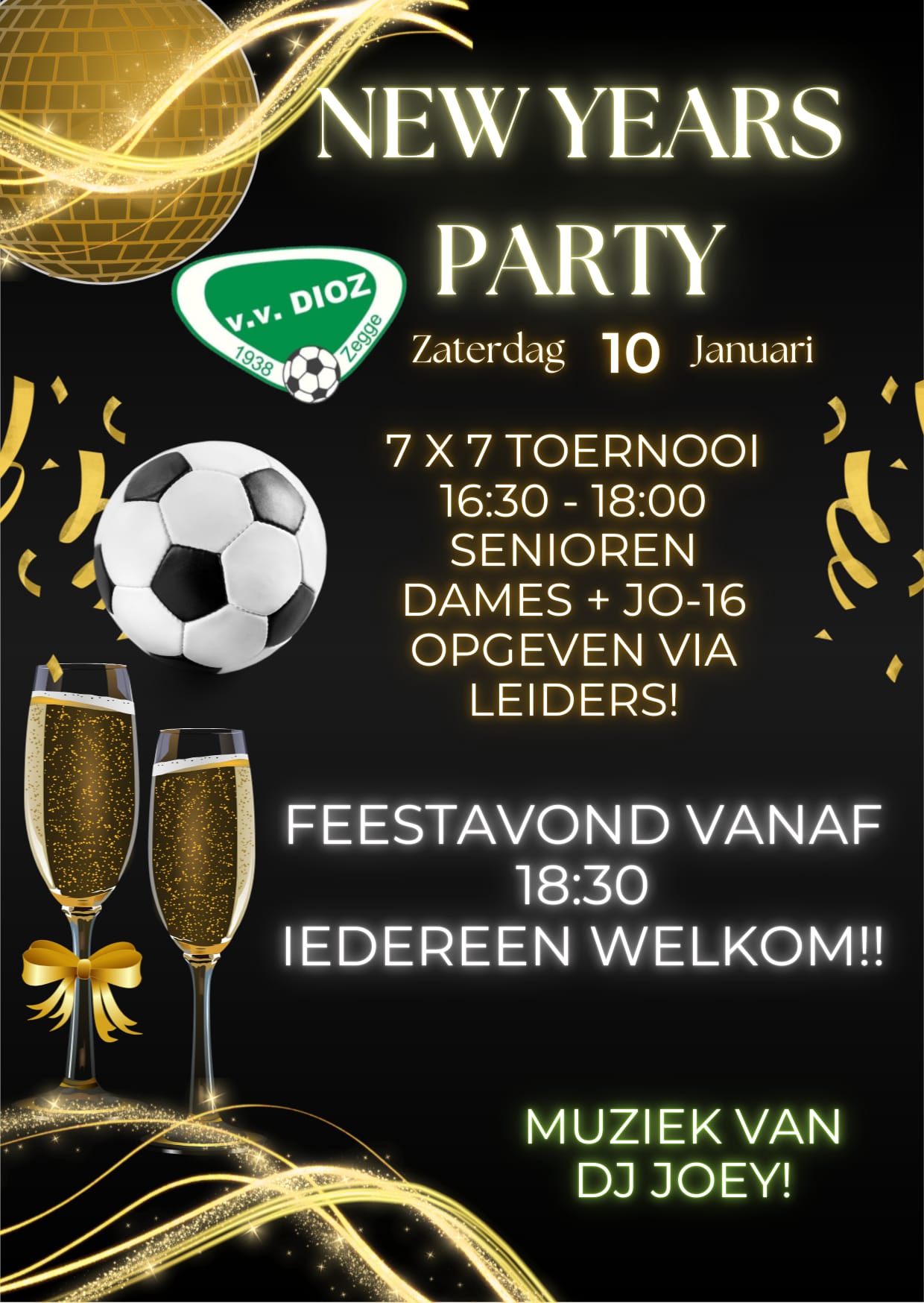 Sportpark 'de Linden' (v.v. DIOZ) Bosschenhoofdseweg 4, Zegge🎆 New Year’s Party bij V.V. DIOZ! 🎆 Om het nieuwe jaar goed te vieren, organiseren we traditiegetrouw onze New Year’s Party bij V.V. DIOZ! Op zaterdag 10 januari trappen we samen het nieuwe jaar af met sportiviteit en gezelligheid. We beginnen de middag met een 7x7 toernooitje voor de senioren, dames en JO16. Het...